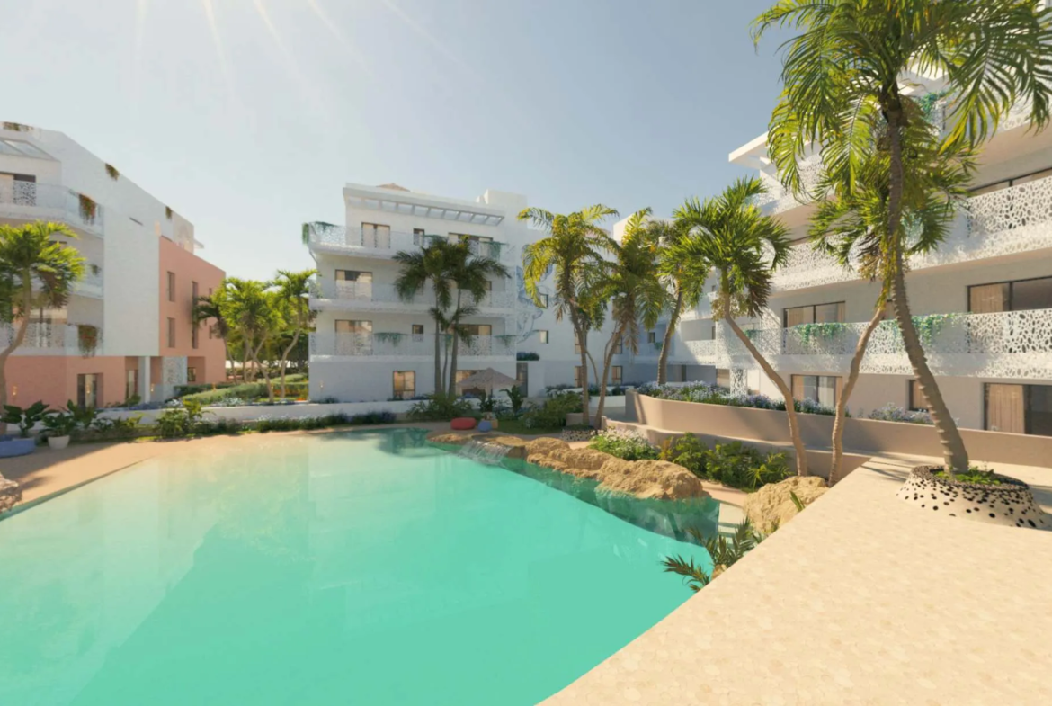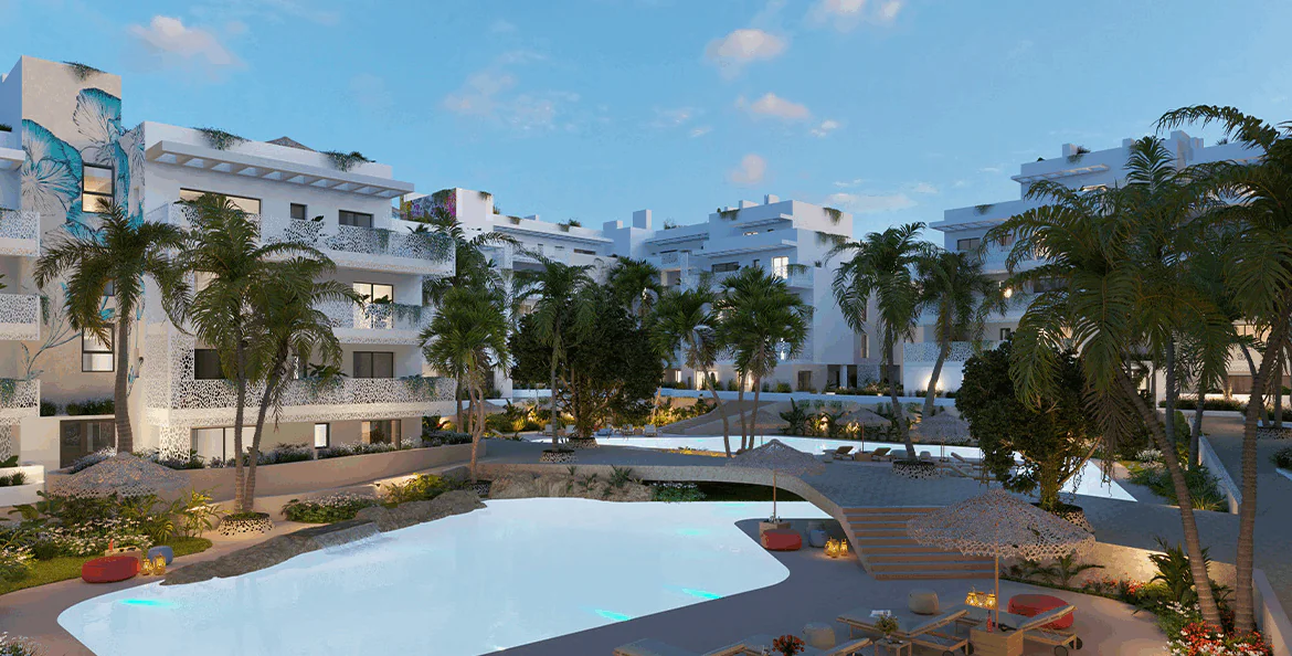 Exkluzivní novostavba s terasou orientovanou na jihozápad, několika bazény a střešní terasou s výhledem na moře, lounge zónou a fitness, situovaná přímo na Playa d’en Bossa.