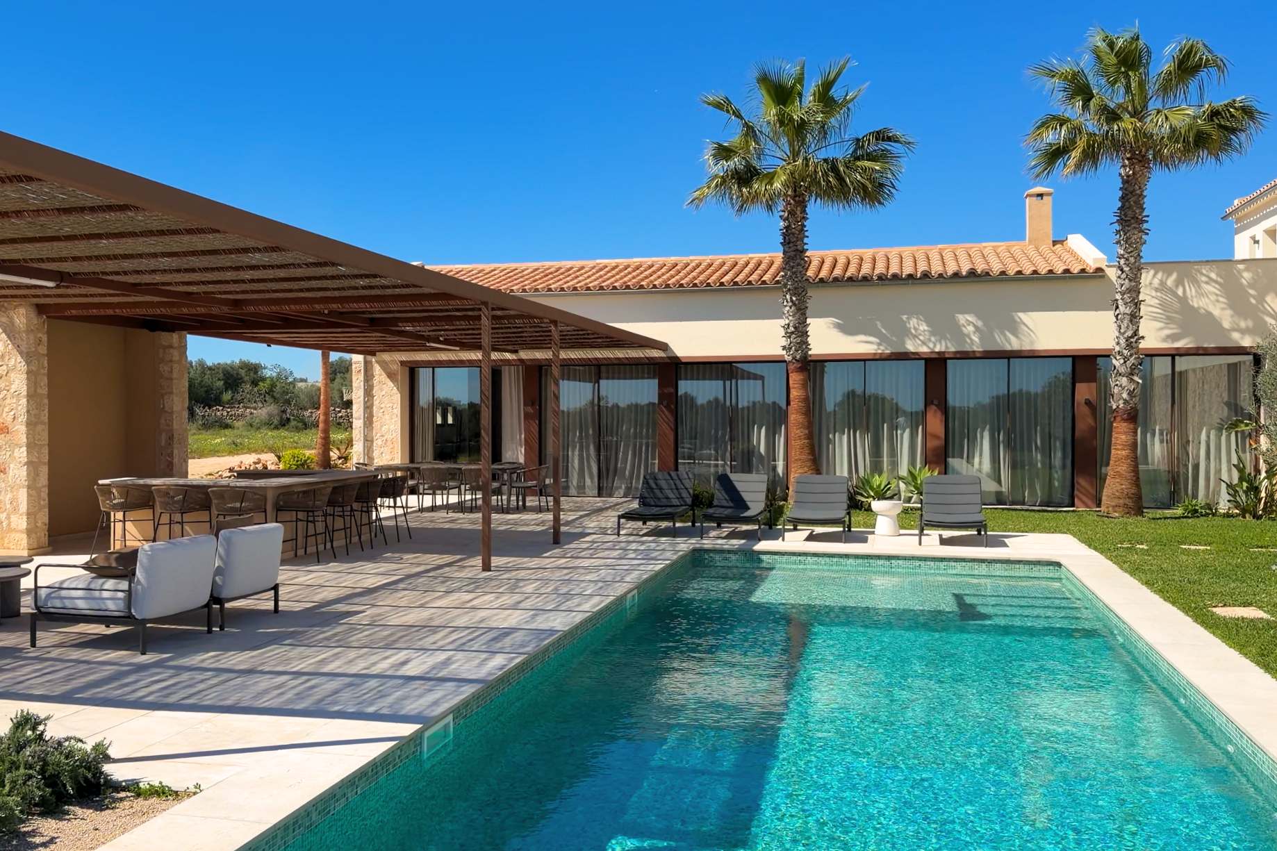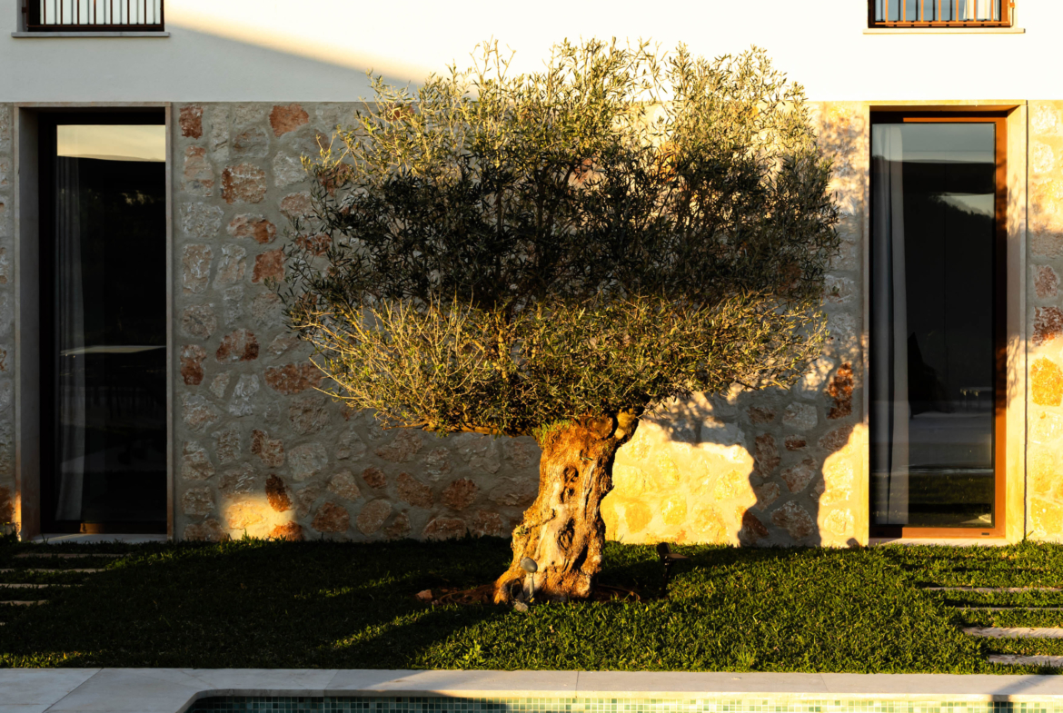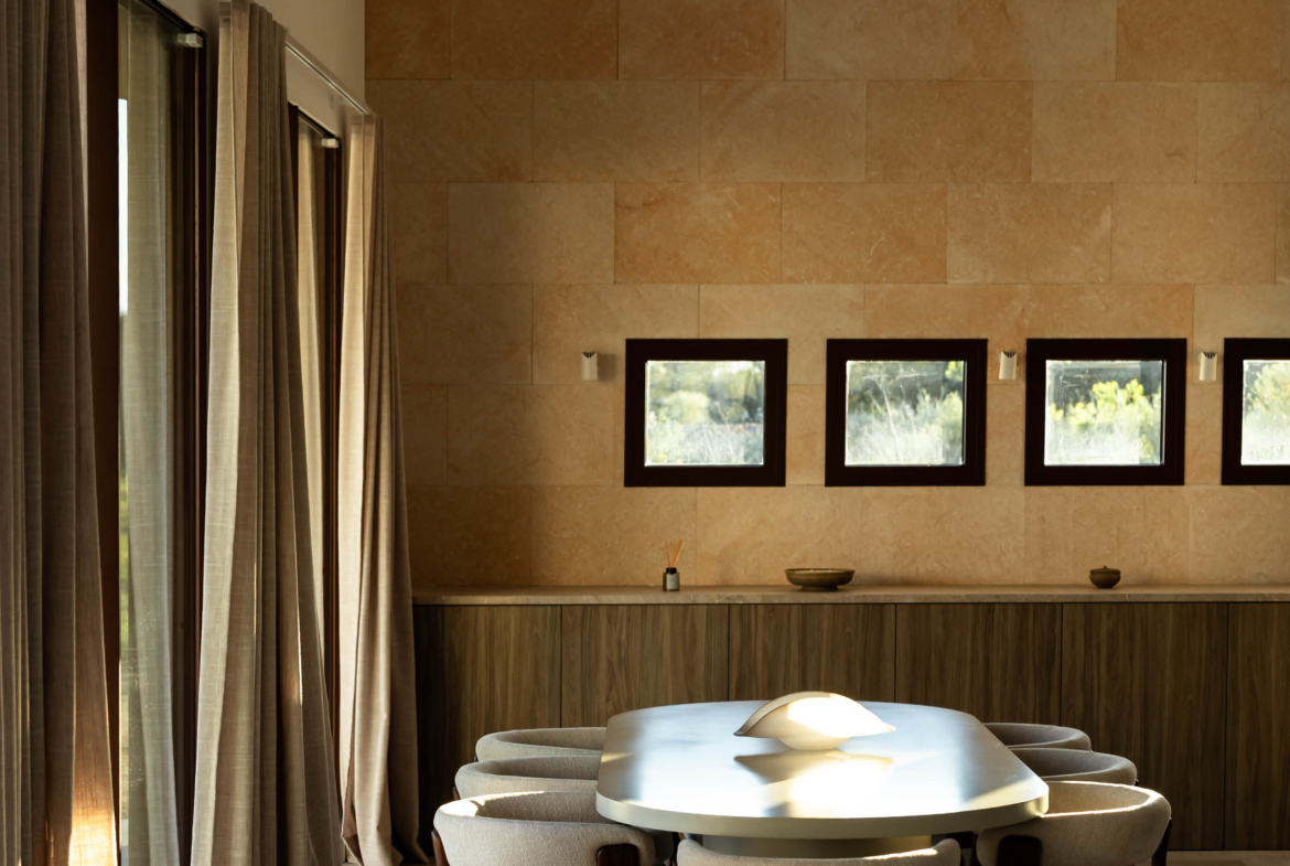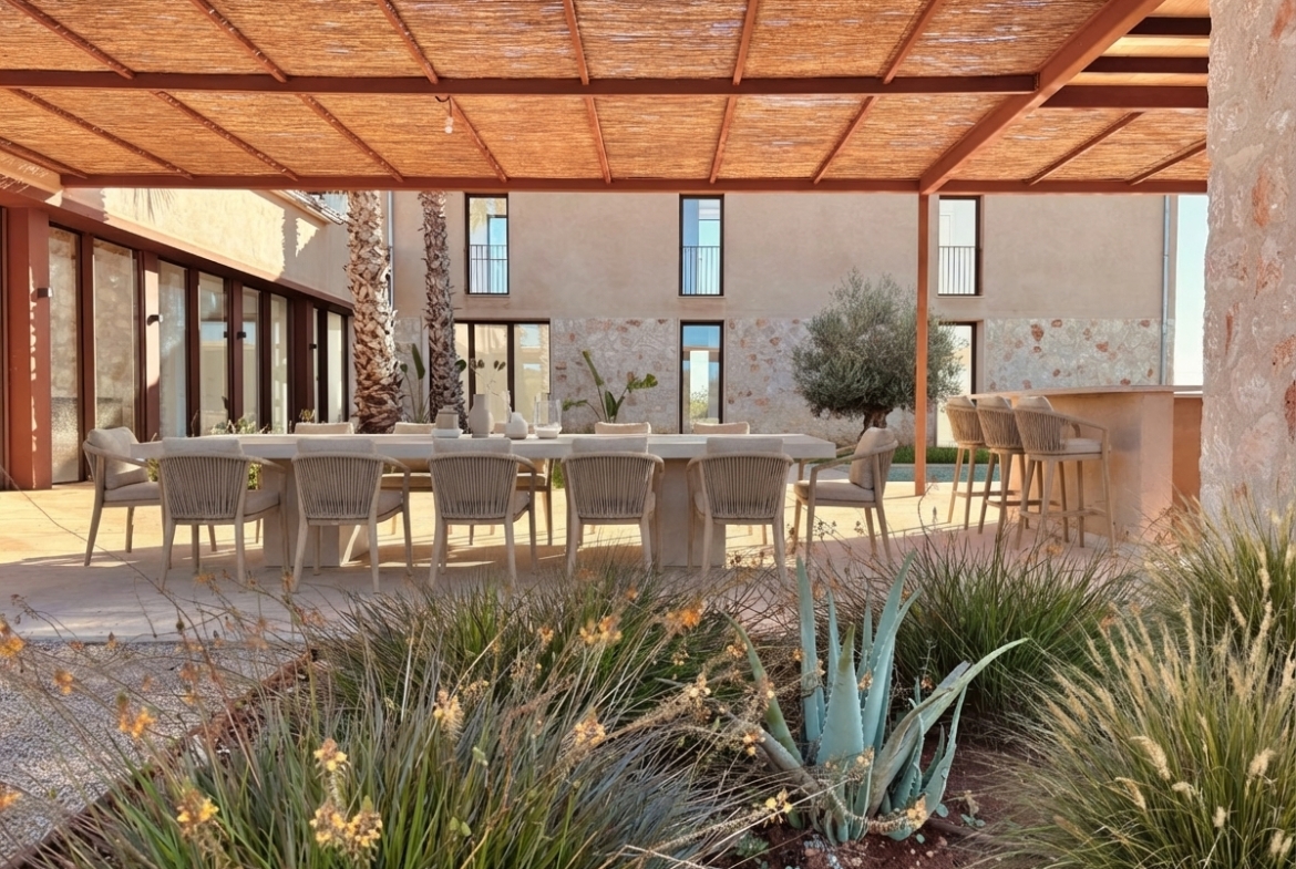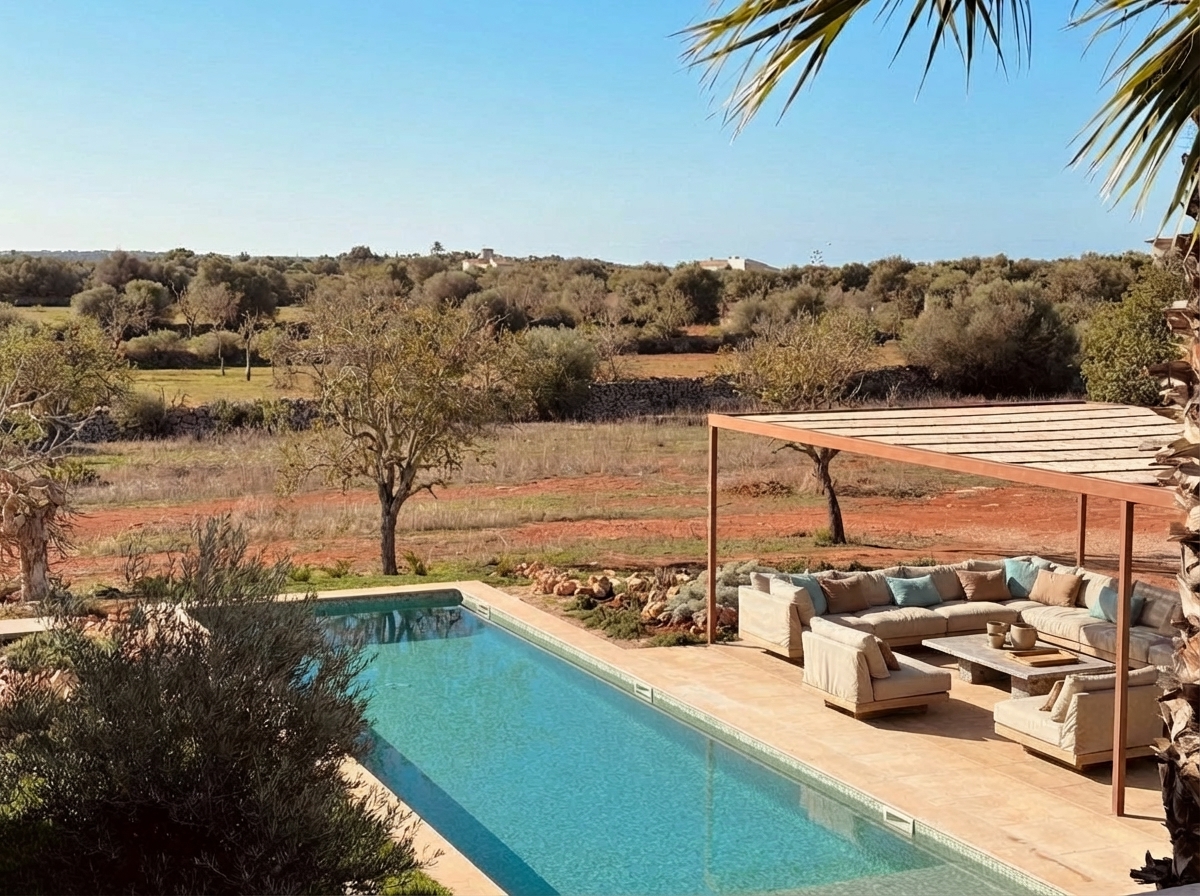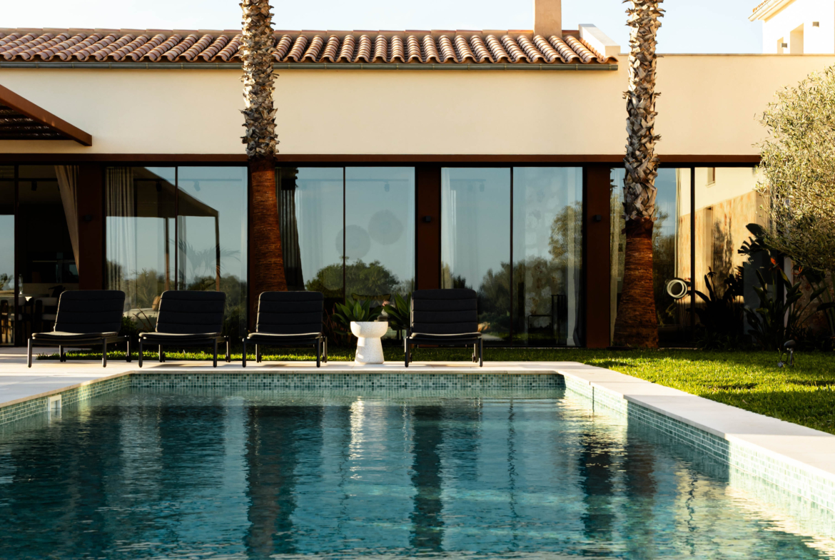 Luxusní finca ve středomořském stylu s panoramatickými výhledy do okolní krajiny, slunnými venkovními prostory, zahradou, bazénem a privátním wellness se saunou – přesně taková, jaká má být na Es Trenc.