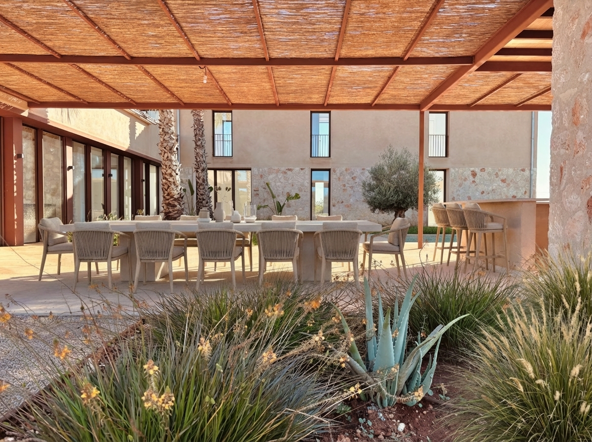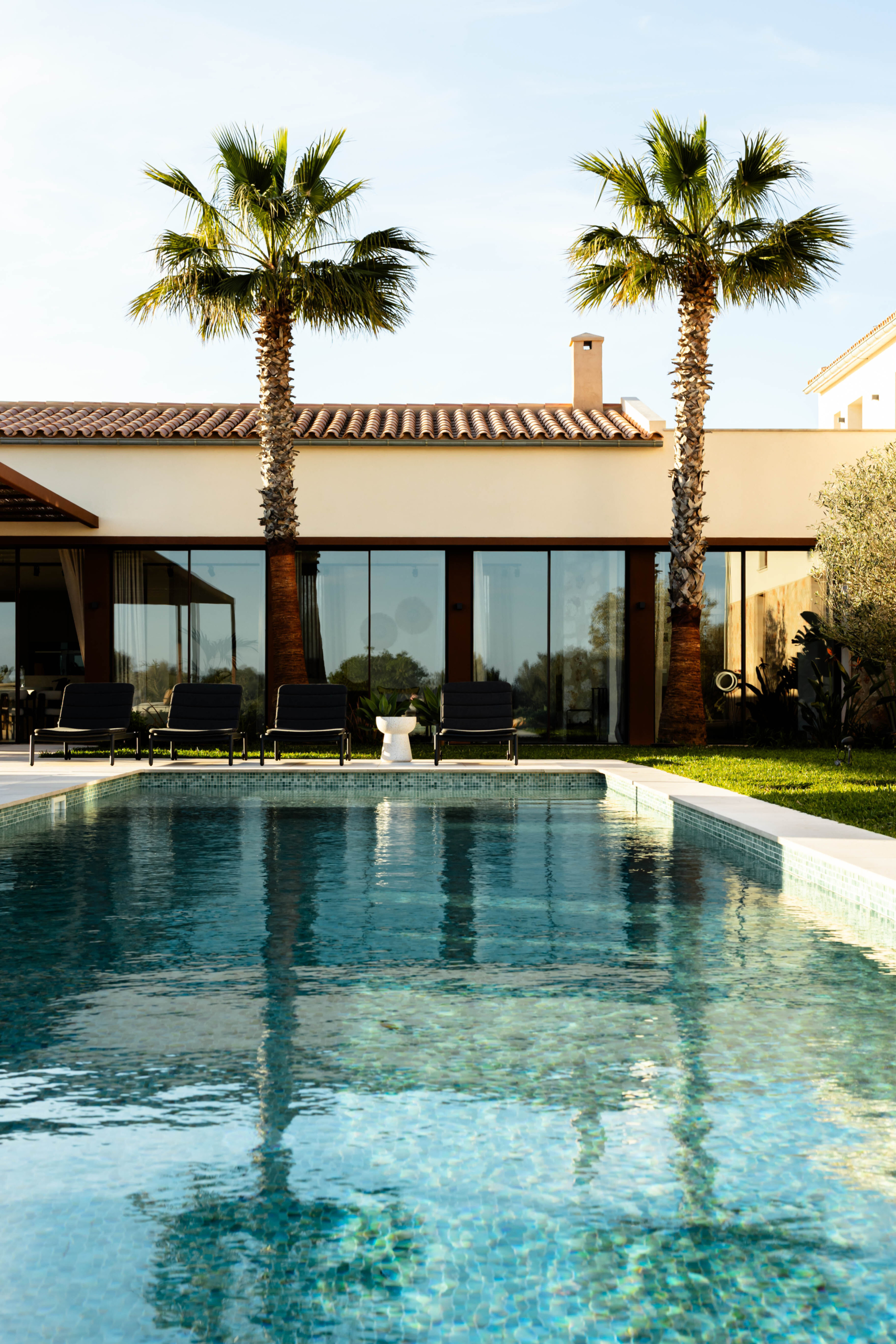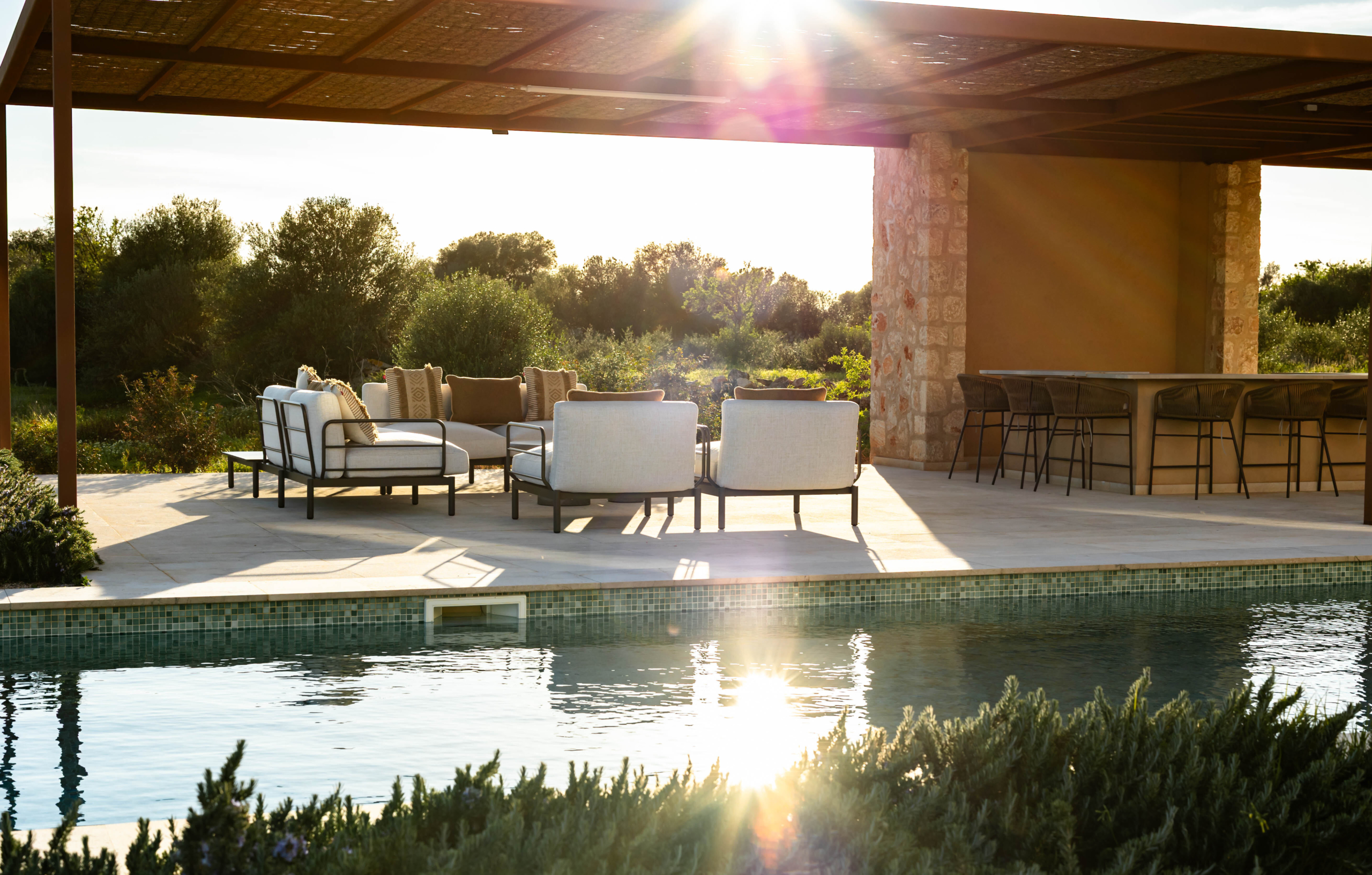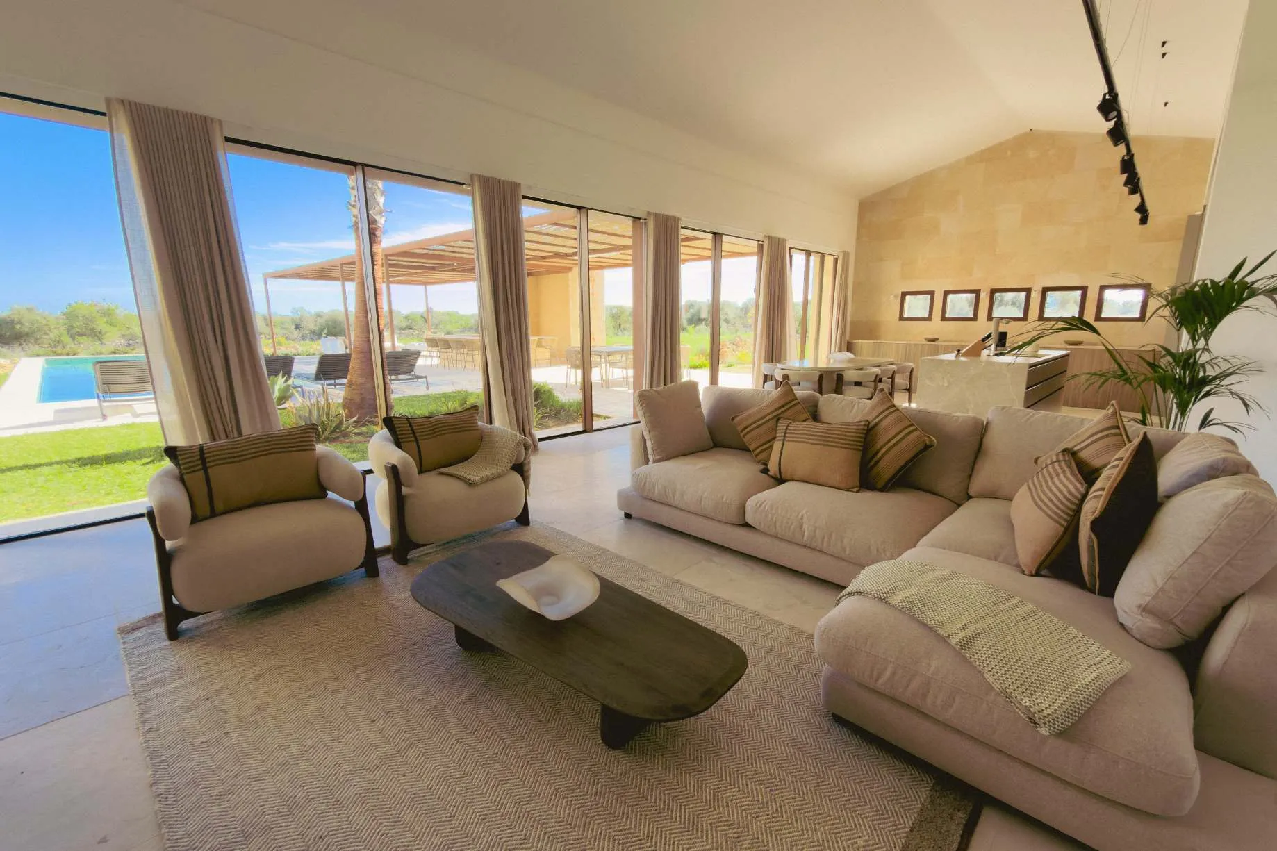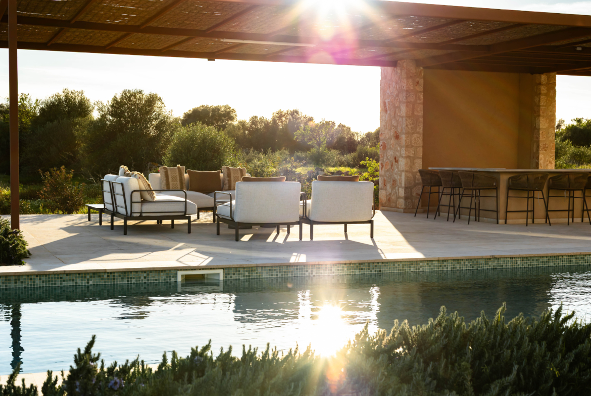Luxusní finca ve středomořském stylu s panoramatickými výhledy do okolní krajiny, slunnými venkovními prostory, zahradou, bazénem a privátním wellness se saunou – přesně taková, jaká má být na Es Trenc.