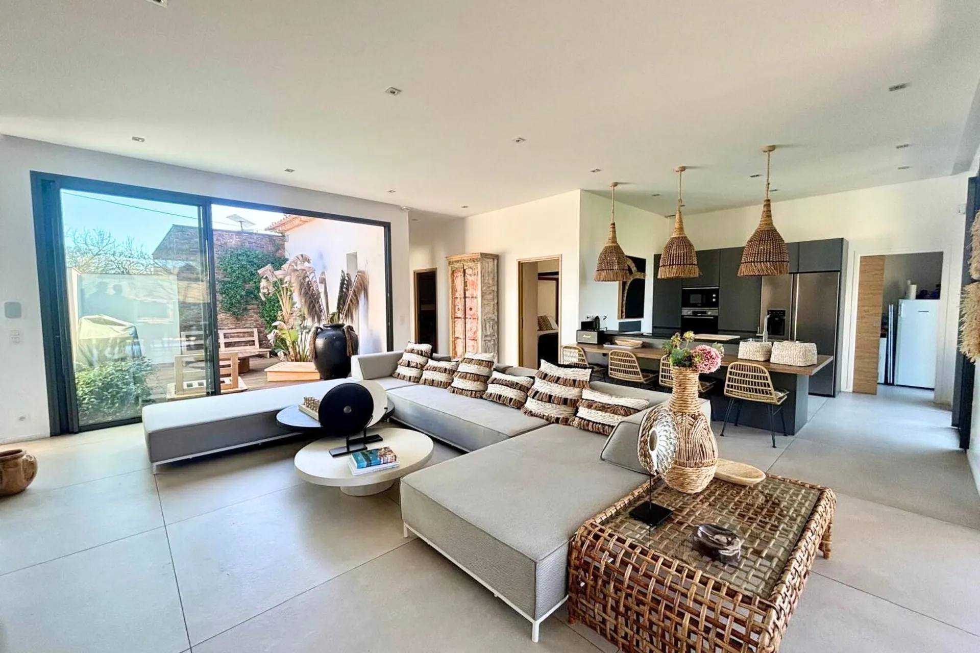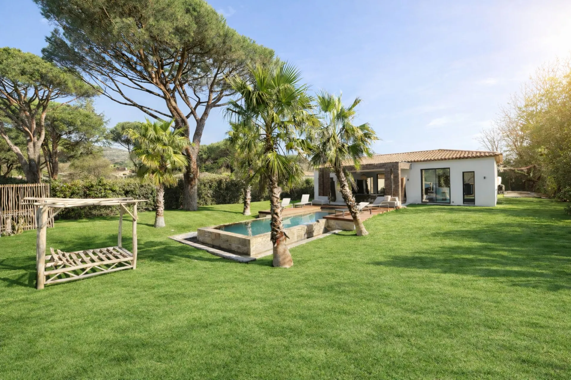 Situata in un contesto tranquillo a Grimaud, vicino a Saint-Tropez, questa villa combina privacy, verde e vicinanza al mare, con viste aperte sulla campagna fino allo storico Château de Grimaud.