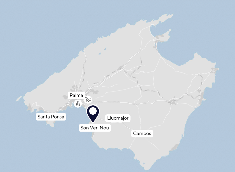 Son Veri Nou è un’elegante e tranquilla zona residenziale sulla costa sud di Maiorca, a pochi minuti a est di El Arenal e a circa 15 minuti in auto da Palma. La posizione direttamente sul mare offre viste panoramiche sulla baia di Palma fino alla Serra de Tramuntana.
